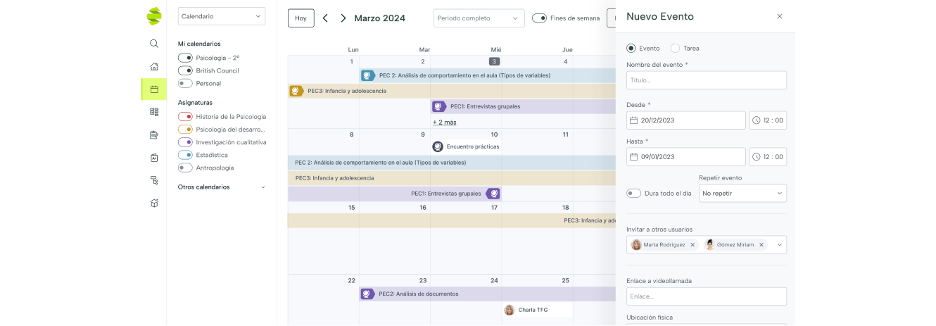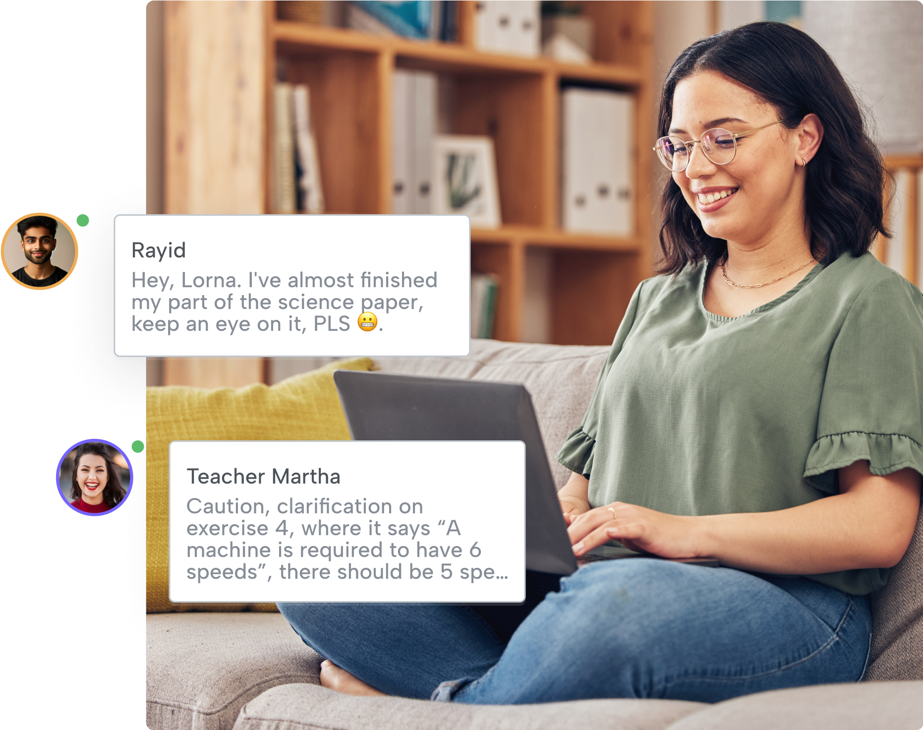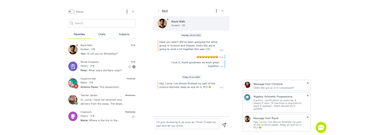 La herramienta de comunicación todo en uno para entornos de aprendizaje: con chats individuales o grupales, conversaciones por asignatura, tarea, actividad, y un modo Foco para desactivar las notificaciones cuando buscas concentración. Agiliza las peticiones entre usuarios (estudiantes, docentes, coordinación, familias…) y mantén la conversación dentro del entorno de tu plataforma.