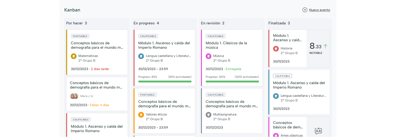 Leemons lleva las herramientas de productividad de las startups más ágiles al mundo educativo y formativo. Con el tablero Kanban, estudiantes y profesores pueden tener bajo control sus tareas de un vistazo, gestionar las cargas de trabajo y adquirir habilidades digitales sin esfuerzo, gracias a un sencillo sistema de tarjetas.