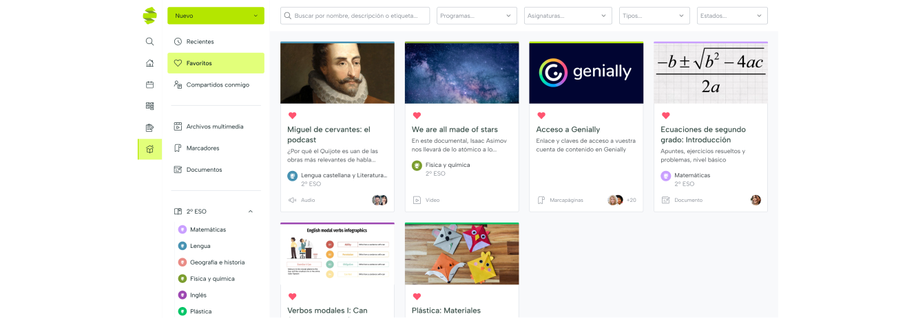 La biblioteca de Leemons permite gestionar todo el contenido creado en la plataforma, los enlaces a sitios externos o los archivos subidos a la nube como vídeos, audios, imágenes… Organizada por carpetas temáticas, con permisos para compartir entre usuarios y un potente sistema de etiquetado para localizar en segundos todo lo que necesitas.