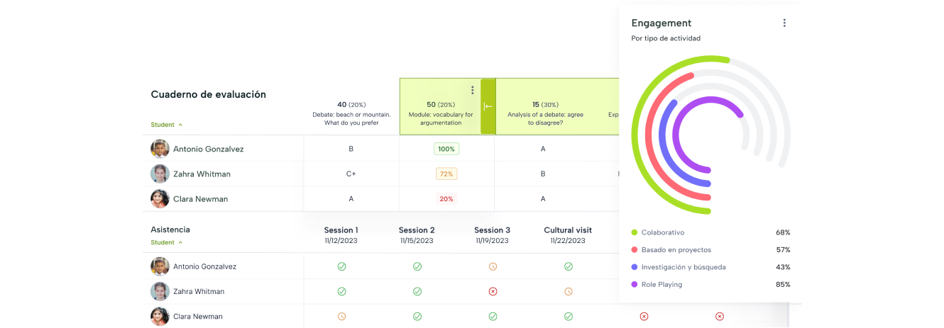 Convierte tu centro en una organización de aprendizaje real, utilizando todo el poder de los datos. Fomenta la autorregulación de los estudiantes con información contextual clara, anticipa el nivel de participación en los grupos y el riesgo de abandono escolar, e implementa ciclos de mejora continua en los programas, contenidos y metodologías.
