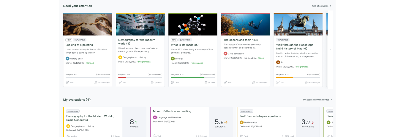 Increíbles paneles de control adaptados a las necesidades de cada perfil de usuario para tener todo a mano. Leemons notifica a los estudiantes sobre las nuevas tareas, las fechas límite o la recepción de notas y calificaciones. Los docentes reciben información continua sobre el progreso de los grupos, las evaluaciones pendientes y los comentarios de su clase.