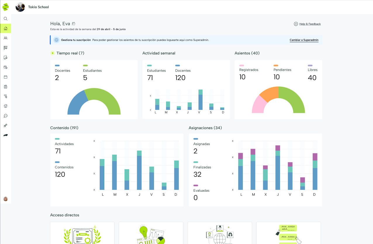 Convierte tu centro en una organización de aprendizaje real, utilizando todo el poder de los datos. Fomenta la autorregulación de los estudiantes con información contextual clara, anticipa el nivel de participación en los grupos y el riesgo de abandono escolar, e implementa ciclos de mejora continua en los programas, contenidos y metodologías.