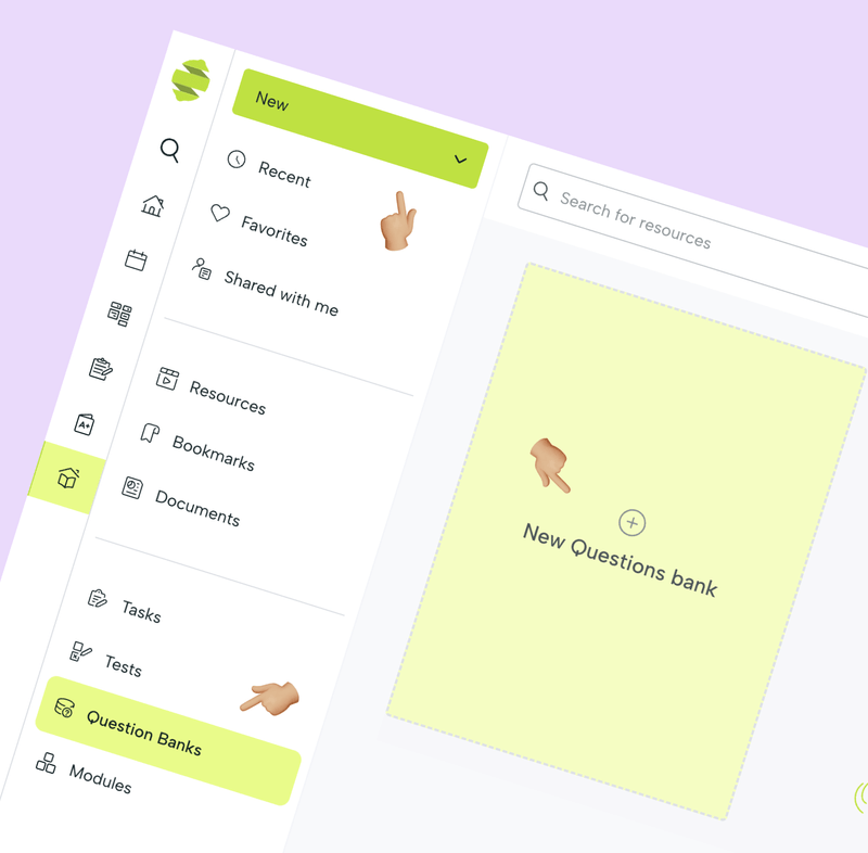 Haz clic en «Nuevo Banco de preguntas» en la sección correspondiente de la biblioteca o haz clic en el menú Nuevo en cualquier otra sección.