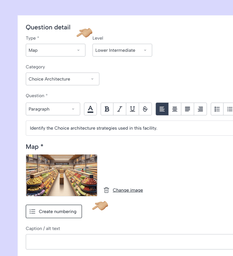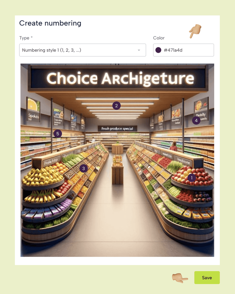 Aquí puede seleccionar el tipo de numeración que queremos añadir a la imagen (letras o números) y el color de los indicadores. A continuación, haz clic en la imagen para crear las áreas donde estarán las respuestas. Una vez que hayas terminado de insertar los números, haz clic en «Guardar».