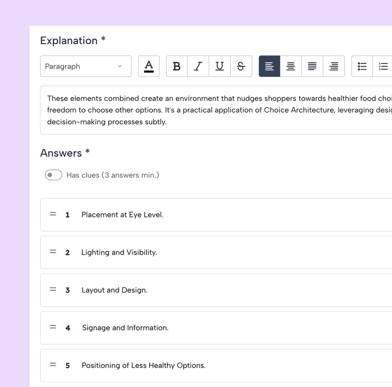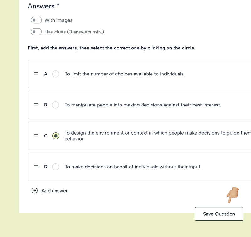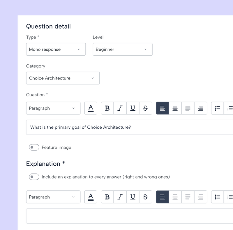 Deberás escribir una pregunta y, si lo deseas, agregar una imagen (por ejemplo, si la pregunta está relacionada con una imagen) e incluir una explicación, que los estudiantes solo verán cuando hayan terminado la prueba.