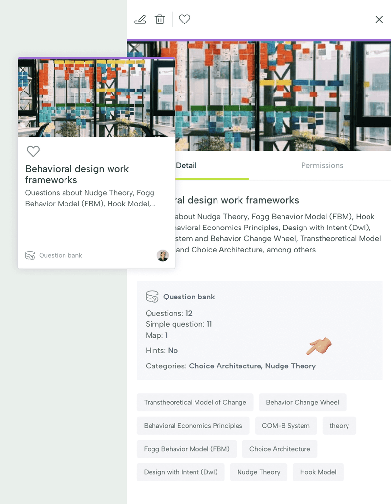 Cuando publiques el banco de preguntas, se cargará en la biblioteca. Si hacemos clic en él para ver la información en detalle, veremos que nos muestra un resumen del número de preguntas, el tipo y las categorías que hemos creado.