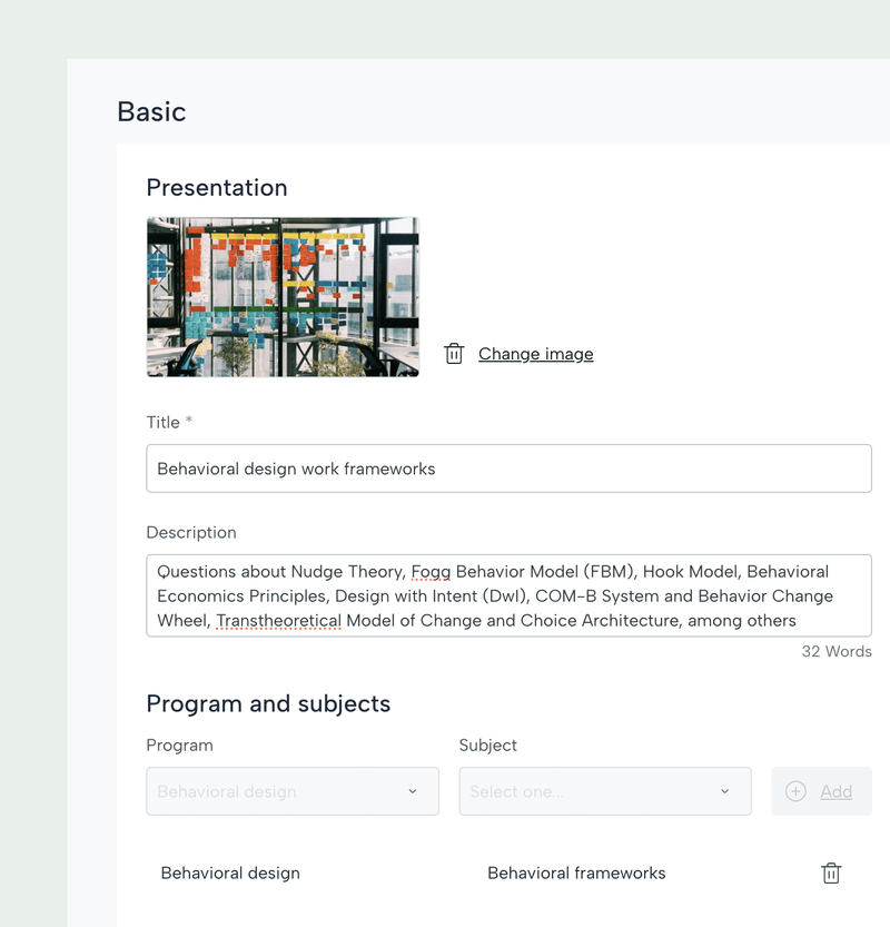 En la ventana de creación encontraremos dos secciones: básica y preguntas. En este primer paso, le damos al banco de preguntas un título, una imagen de portada y una descripción. También debemos etiquetarlo con el tema al que hace referencia.