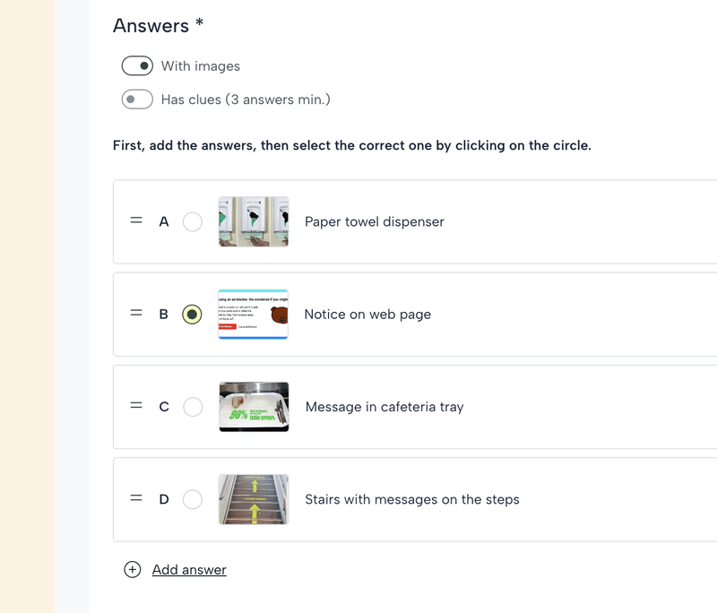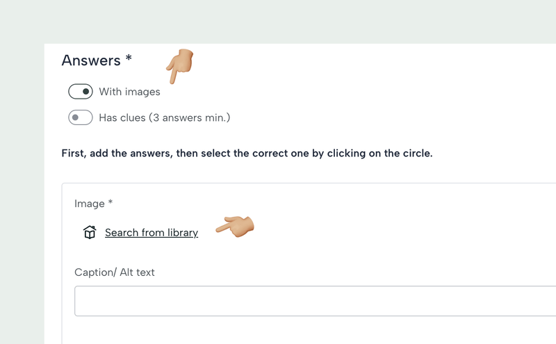 Si habilitas la opción Imágenes en el campo Respuestas, los campos de respuesta te permitirán buscar una foto en la biblioteca para cada respuesta e incluir un texto alternativo.