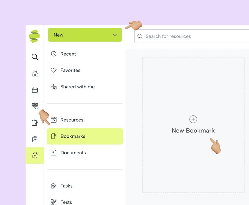Los marcadores se almacenan en la sección Marcadores de la biblioteca de Leemons. Para crear un nuevo marcador, debes hacer clic en Nuevo marcador en esa sección o también puedes crearlo desde cualquier otra sección haciendo clic en el botón Nuevo en la esquina superior izquierda y seleccionando «Marcador».