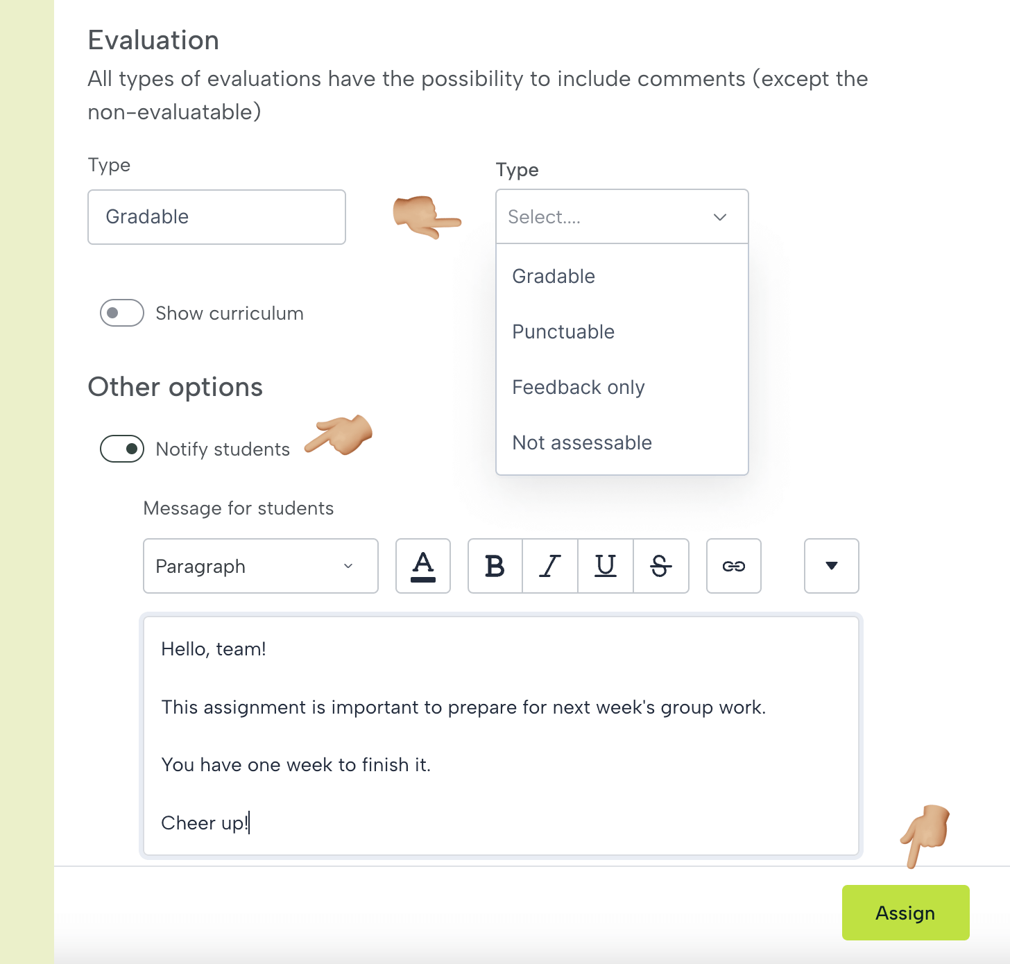 Hay cuatro tipos de evaluación que puedes ver en la imagen: calificable (va al libro de calificaciones y hace media con el resto), puntuable, con comentarios (ambas dan una calificación al alumno pero no guardan la calificación ni el promedio) y no calificada (por ejemplo, para que el estudiante revise o practique temas sin la ayuda del profesor), elige la que corresponda.