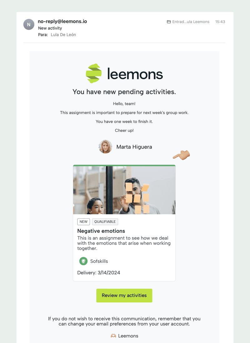 Si ha marcado la opción «Notificar a los estudiantes», los estudiantes recibirán un correo electrónico en su buzón y, al hacer clic en él, podrán acceder directamente a la tarea. Este correo electrónico incluirá el mensaje personalizado del profesor, así como el nombre y la imagen del profesor.