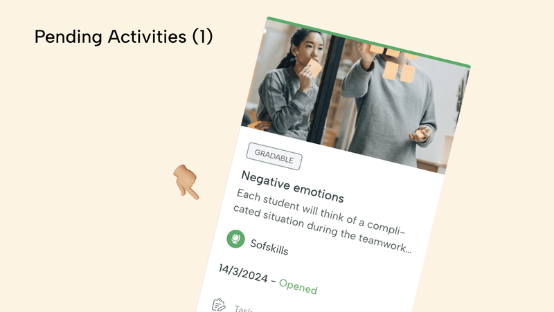 Tanto en el panel del programa como en el de la asignatura, el estudiante podrá ver que tiene esta tarea disponible para completarla. Al hacer clic en la tarjeta, los estudiantes accederán para iniciar la tarea.