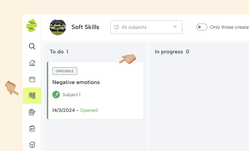 Leemons se basa en la metodología de aprendizaje ágil, los alumnos pueden gestionar su carga de trabajo con una herramienta llamada Kanban. Cuando se asigna una tarea a un alumno, aparecerá en la columna de tareas pendientes. Al hacer clic en ella, podrán ver los detalles de la tarea e iniciarla.