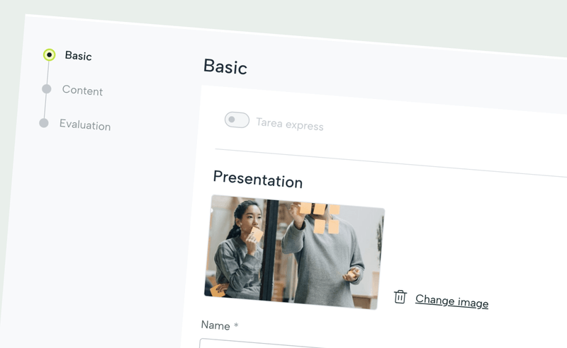En la ventana de creación de tareas o actividades, avanzaremos por tres secciones: básica, contenido y evaluación. A lo largo del proceso y en función de las opciones que activemos, pueden aparecer nuevos pasos.