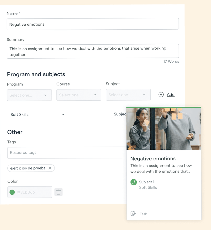 Indica si esta tarea está relacionada con un tema, en cuyo caso el color de la tarjeta será el de la asignatura o tema. Y, si es necesario, puedes incluir etiquetas personalizadas.