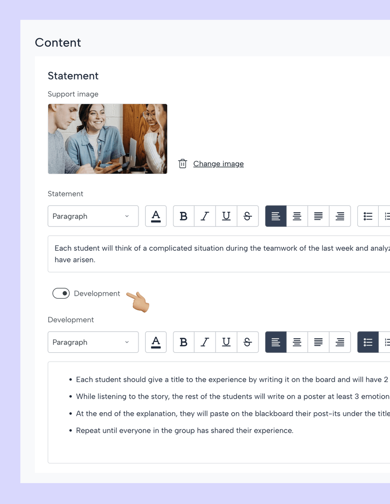 Puedes activar la sección «Desarrollo» para introducir información sobre el proceso paso a paso para realizar la tarea.