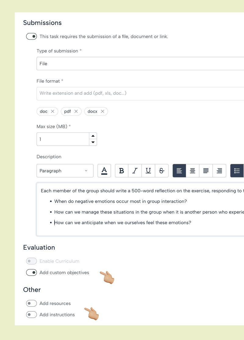 En este paso también se definen los criterios y objetivos de evaluación (en la versión gratuita, el plan de estudios no está activo, pero es posible incluir sus objetivos personalizados para esta tarea) y otros elementos, como agregar recursos o instrucciones que crearán otro paso más adelante.