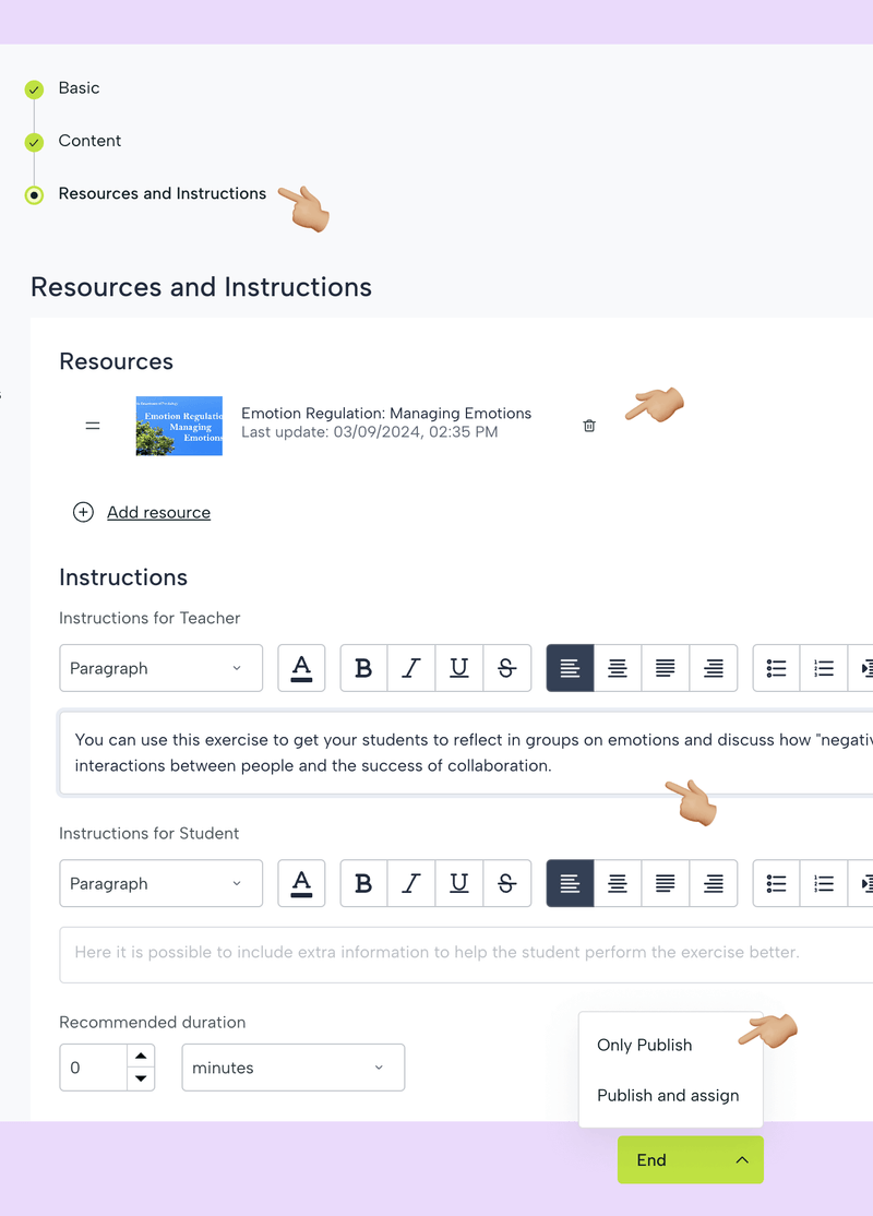 En este paso, puedes agregar enlaces o archivos para que el estudiante los use como material de estudio para resolver la tarea. En la sección de instrucciones puedes dar información a otros profesores (que pueden utilizar correctamente esta tarea en sus clases) o a los alumnos.