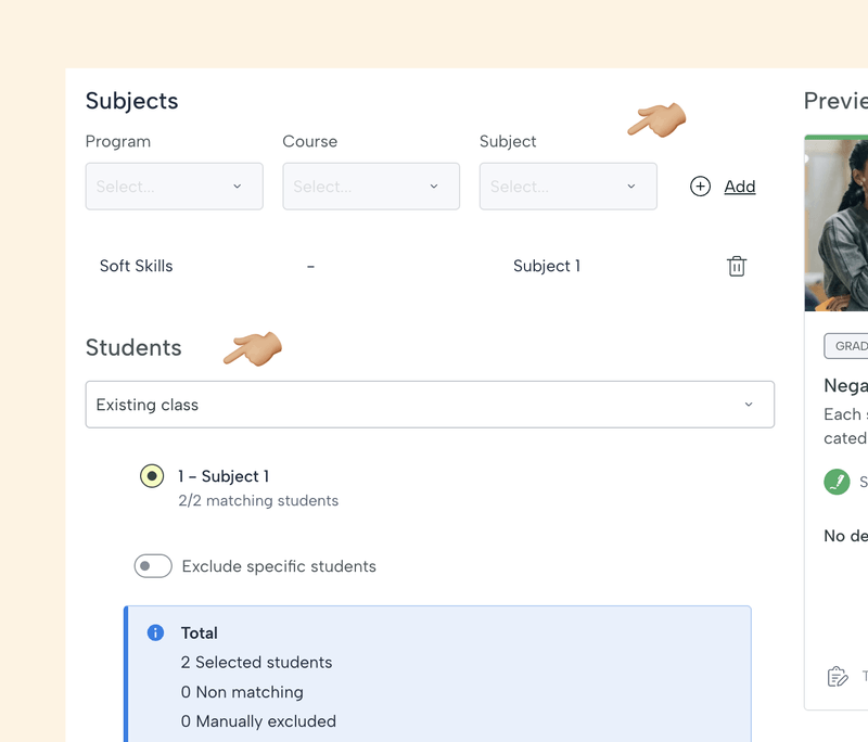 El primer paso es elegir la asignatura y el grupo de alumnos. Se puede asignar una tarea a toda una clase (de la que podemos excluir a algunos estudiantes si es necesario), a un grupo de estudiantes (al que podemos nombrar) o a un estudiante específico.