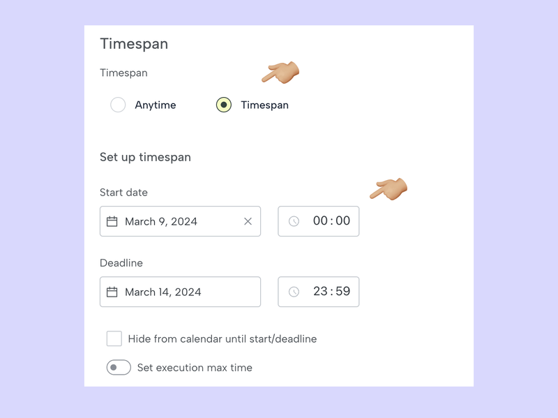 Puedes establecer la tarea sin una fecha límite para que los estudiantes la completen cuando lo deseen o establecer un límite de tiempo, después del cual es posible que los estudiantes ya no puedan enviar la tarea.